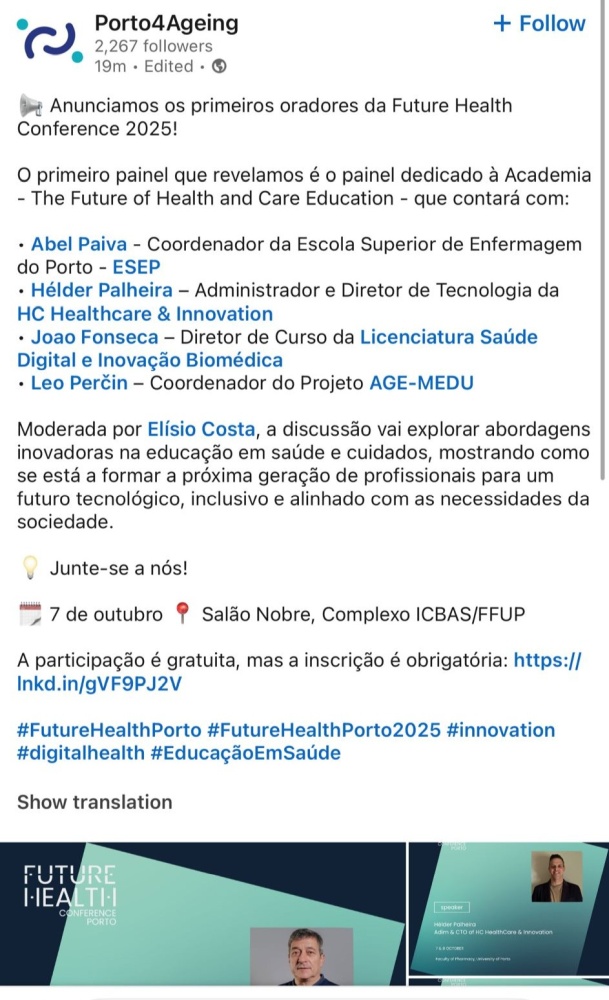AGE-MEDU sudjelovao je na konferenciji Future Health Conference, održanoj na Farmaceutskom fakultetu Sveučilišta u Portu u organizaciji Porto4Ageing.